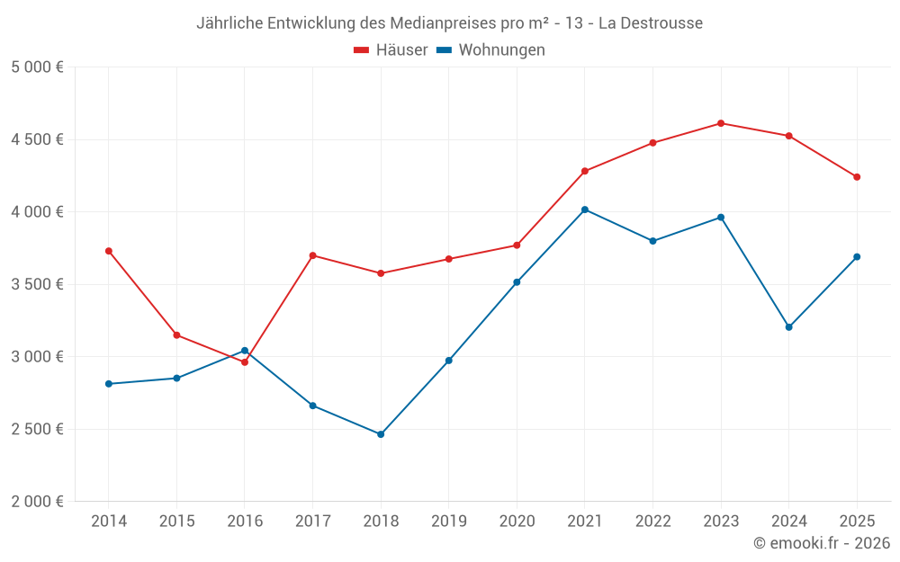 Der Durchschnittspreis auf den 21 Hausgeschäften der letzten 12 Monate in der Gemeinde La Destrousse betrug 4 241 € pro Quadratmeter für einen mittleren Immobilienwert von 360 000 €. Über diesen Zeitraum hinweg lagen 60% der Transaktionen zwischen 3 444 und 4 932 € pro Quadratmeter (vom 2. bis zum 8. Dezil).