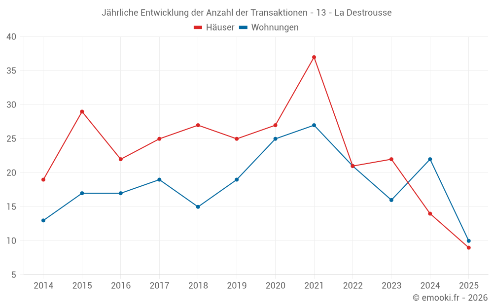 Der Durchschnittspreis auf den 22 Wohnungstransaktionen der letzten 12 Monate in der Gemeinde La Destrousse betrug 3 610 € pro Quadratmeter für einen mittleren Immobilienwert von 252 775 €. Über diesen Zeitraum hinweg lagen 60% der Transaktionen zwischen 2 893 und 4 719 € pro Quadratmeter (vom 2. bis zum 8. Dezil).