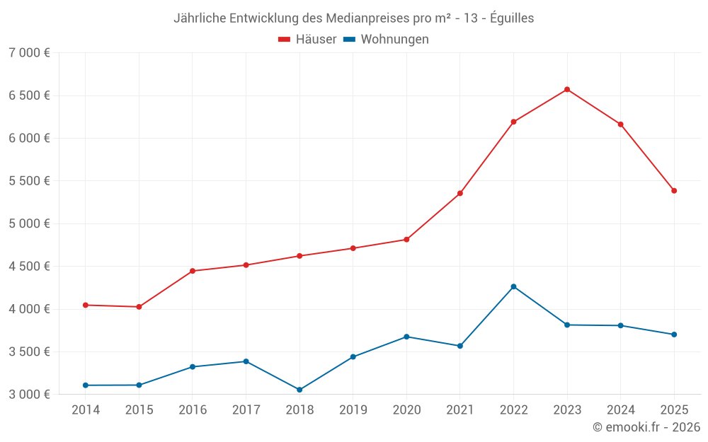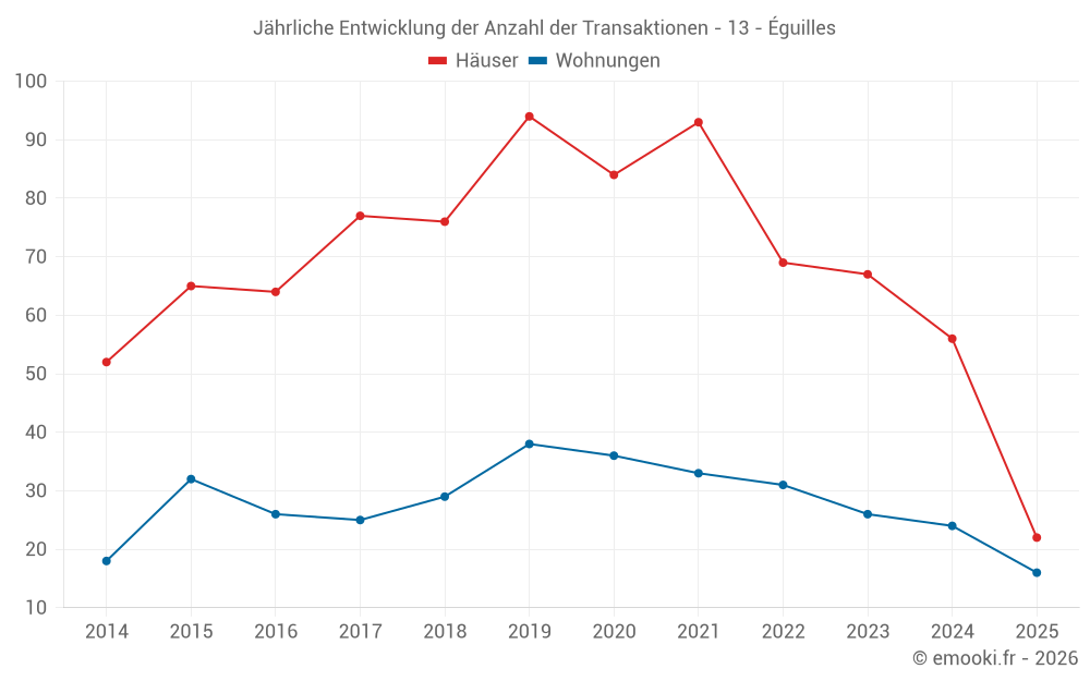 Der Durchschnittspreis auf den 27 Wohnungstransaktionen der letzten 12 Monate in der Gemeinde Éguilles betrug 3 703 € pro Quadratmeter für einen mittleren Immobilienwert von 225 000 €. Über diesen Zeitraum hinweg lagen 60% der Transaktionen zwischen 2 937 und 4 284 € pro Quadratmeter (vom 2. bis zum 8. Dezil).