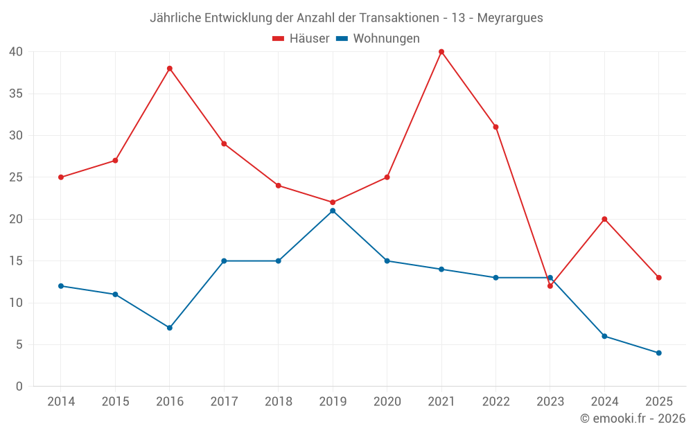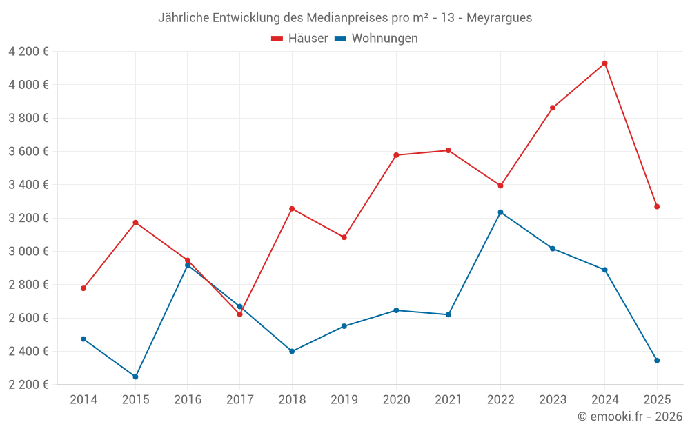 Der Durchschnittspreis auf den 22 Hausgeschäften der letzten 12 Monate in der Gemeinde Meyrargues betrug 3 692 € pro Quadratmeter für einen mittleren Immobilienwert von 337 500 €. Über diesen Zeitraum hinweg lagen 60% der Transaktionen zwischen 2 535 und 5 616 € pro Quadratmeter (vom 2. bis zum 8. Dezil).