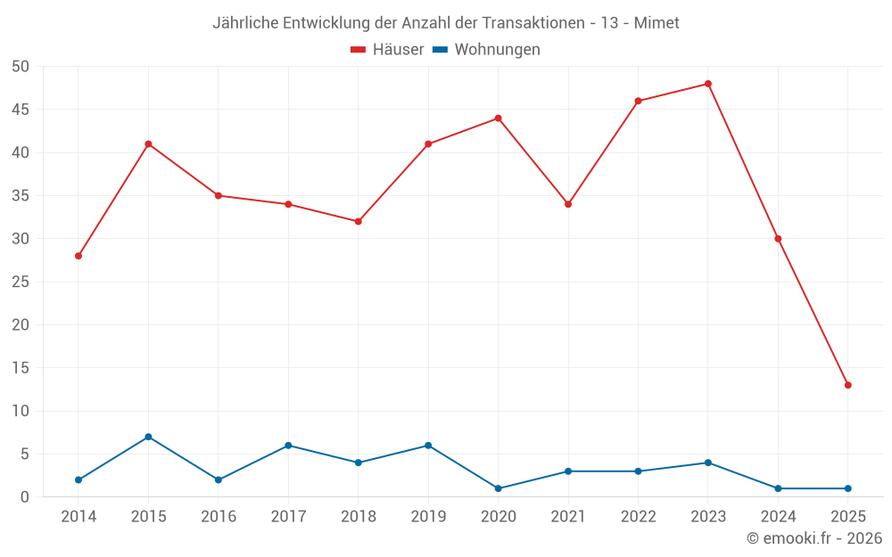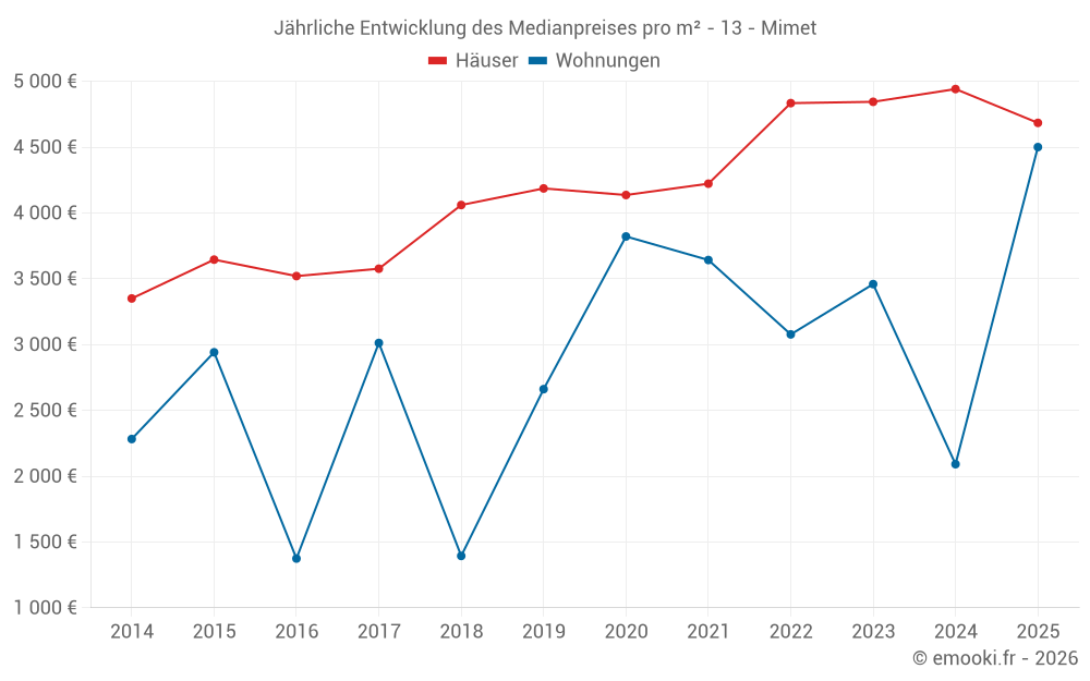 Der Durchschnittspreis auf den 34 Hausgeschäften der letzten 12 Monate in der Gemeinde Mimet betrug 4 994 € pro Quadratmeter für einen mittleren Immobilienwert von 511 405 €. Über diesen Zeitraum hinweg lagen 60% der Transaktionen zwischen 4 060 und 5 728 € pro Quadratmeter (vom 2. bis zum 8. Dezil).