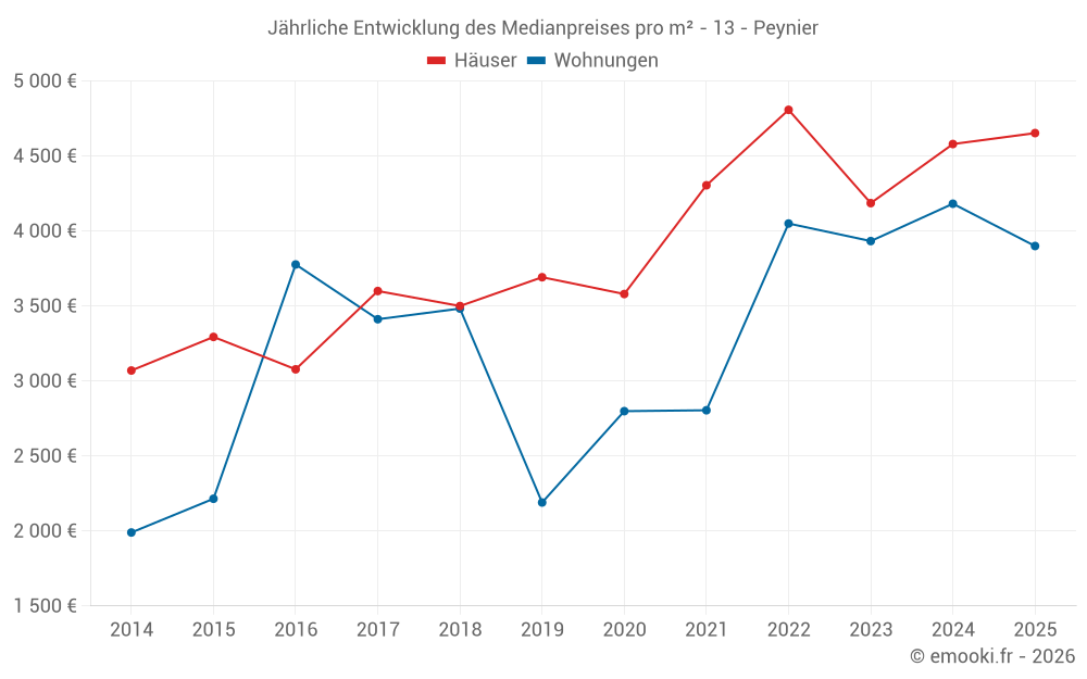 Der Durchschnittspreis auf den 24 Wohnungstransaktionen der letzten 24 Monate in der Gemeinde Peynier betrug 4 030 € pro Quadratmeter für einen mittleren Immobilienwert von 212 800 €. Über diesen Zeitraum hinweg lagen 60% der Transaktionen zwischen 3 673 und 4 291 € pro Quadratmeter (vom 2. bis zum 8. Dezil).