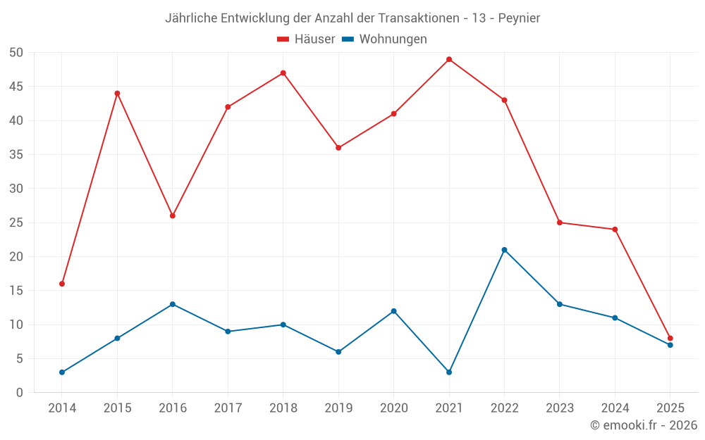 Der Durchschnittspreis auf den 19 Hausgeschäften der letzten 12 Monate in der Gemeinde Peynier betrug 4 621 € pro Quadratmeter für einen mittleren Immobilienwert von 402 220 €. Über diesen Zeitraum hinweg lagen 60% der Transaktionen zwischen 3 611 und 5 216 € pro Quadratmeter (vom 2. bis zum 8. Dezil).