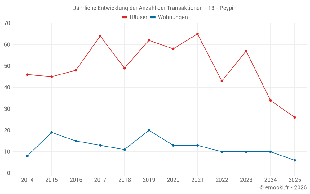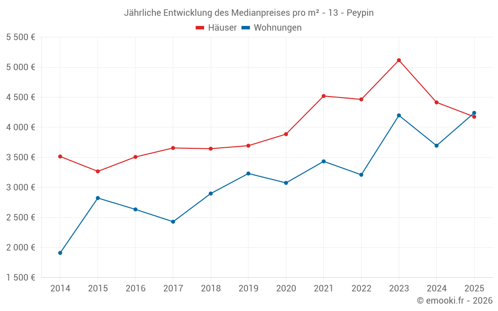Der Durchschnittspreis auf den 26 Hausgeschäften der letzten 6 Monate in der Gemeinde Peypin betrug 4 175 € pro Quadratmeter für einen mittleren Immobilienwert von 389 650 €. Über diesen Zeitraum hinweg lagen 60% der Transaktionen zwischen 3 675 und 4 664 € pro Quadratmeter (vom 2. bis zum 8. Dezil).