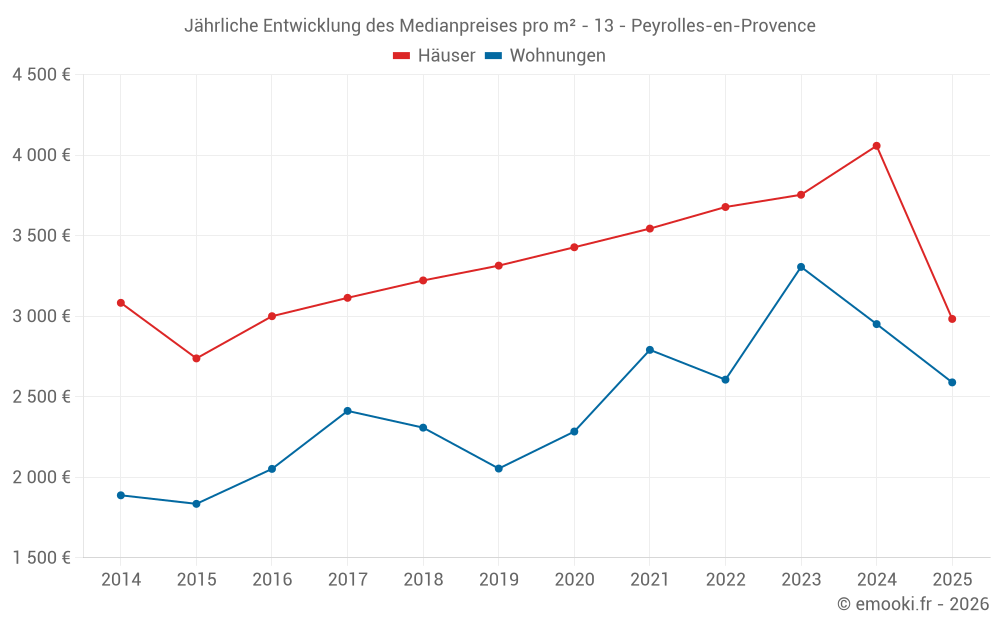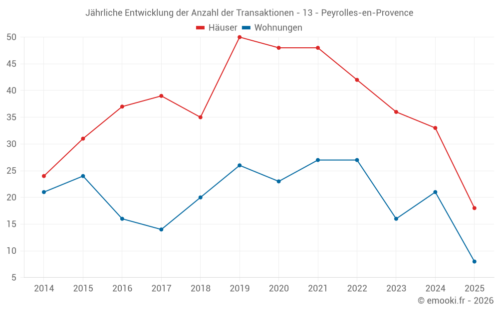 Der Durchschnittspreis auf den 20 Wohnungstransaktionen der letzten 12 Monate in der Gemeinde Peyrolles-en-Provence betrug 2 557 € pro Quadratmeter für einen mittleren Immobilienwert von 144 750 €. Über diesen Zeitraum hinweg lagen 60% der Transaktionen zwischen 2 092 und 3 341 € pro Quadratmeter (vom 2. bis zum 8. Dezil).