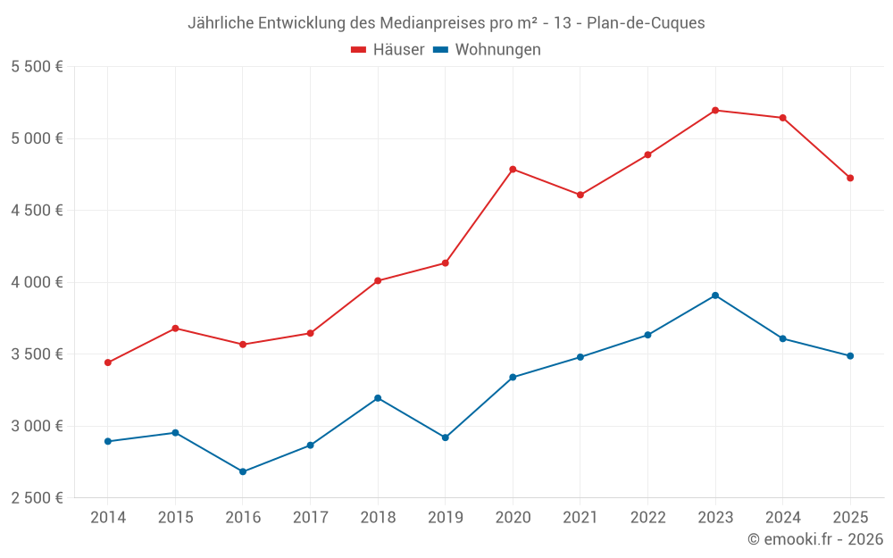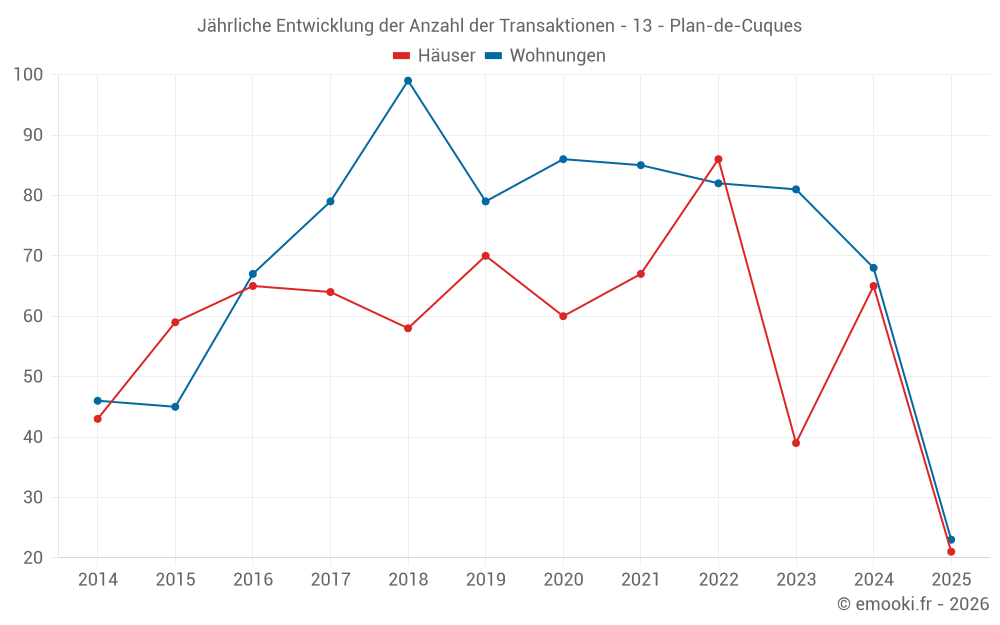 Der Durchschnittspreis auf den 21 Hausgeschäften der letzten 6 Monate in der Gemeinde Plan-de-Cuques betrug 4 725 € pro Quadratmeter für einen mittleren Immobilienwert von 394 190 €. Über diesen Zeitraum hinweg lagen 60% der Transaktionen zwischen 3 650 und 5 663 € pro Quadratmeter (vom 2. bis zum 8. Dezil).