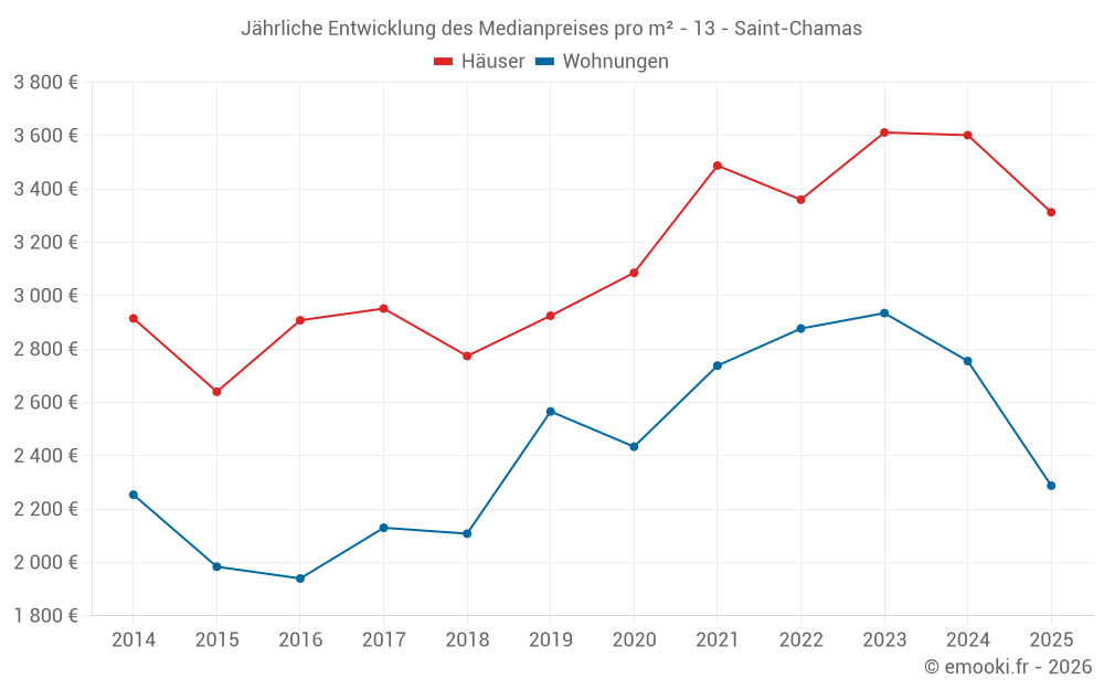 Der Durchschnittspreis auf den 27 Hausgeschäften der letzten 6 Monate in der Gemeinde Saint-Chamas betrug 3 313 € pro Quadratmeter für einen mittleren Immobilienwert von 360 000 €. Über diesen Zeitraum hinweg lagen 60% der Transaktionen zwischen 2 146 und 4 305 € pro Quadratmeter (vom 2. bis zum 8. Dezil).