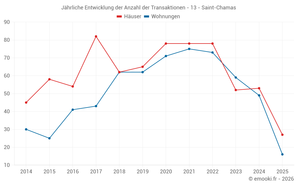 Der Durchschnittspreis auf den 46 Wohnungstransaktionen der letzten 12 Monate in der Gemeinde Saint-Chamas betrug 2 762 € pro Quadratmeter für einen mittleren Immobilienwert von 144 875 €. Über diesen Zeitraum hinweg lagen 60% der Transaktionen zwischen 2 090 und 3 566 € pro Quadratmeter (vom 2. bis zum 8. Dezil).