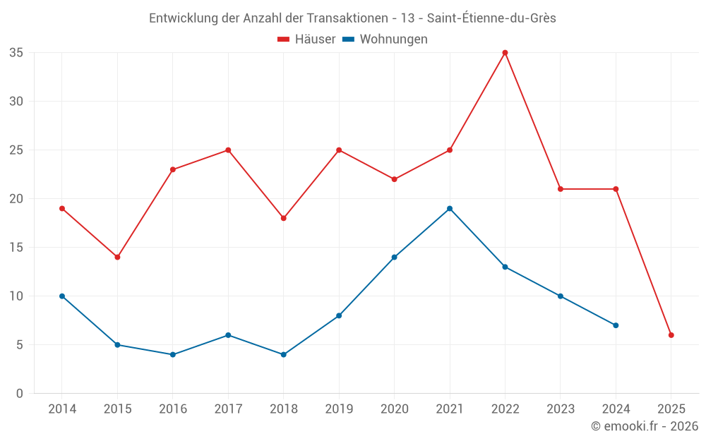 Der Durchschnittspreis auf den 18 Hausgeschäften der letzten 12 Monate in der Gemeinde Saint-Étienne-du-Grès betrug 3 278 € pro Quadratmeter für einen mittleren Immobilienwert von 366 500 €. Über diesen Zeitraum hinweg lagen 60% der Transaktionen zwischen 2 687 und 4 424 € pro Quadratmeter (vom 2. bis zum 8. Dezil).