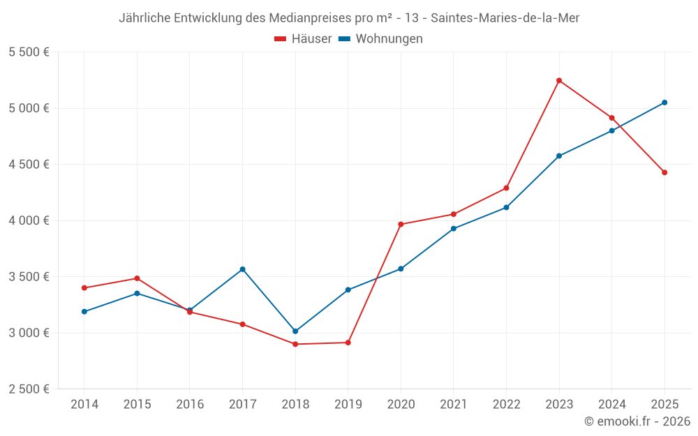 Der Durchschnittspreis auf den 25 Wohnungstransaktionen der letzten 6 Monate in der Gemeinde Saintes-Maries-de-la-Mer betrug 5 051 € pro Quadratmeter für einen mittleren Immobilienwert von 171 015 €. Über diesen Zeitraum hinweg lagen 60% der Transaktionen zwischen 3 835 und 5 821 € pro Quadratmeter (vom 2. bis zum 8. Dezil).