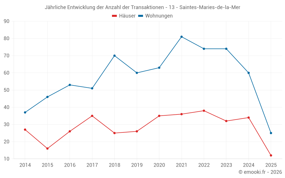 Der Durchschnittspreis auf den 29 Hausgeschäften der letzten 12 Monate in der Gemeinde Saintes-Maries-de-la-Mer betrug 4 856 € pro Quadratmeter für einen mittleren Immobilienwert von 280 000 €. Über diesen Zeitraum hinweg lagen 60% der Transaktionen zwischen 3 459 und 6 548 € pro Quadratmeter (vom 2. bis zum 8. Dezil).