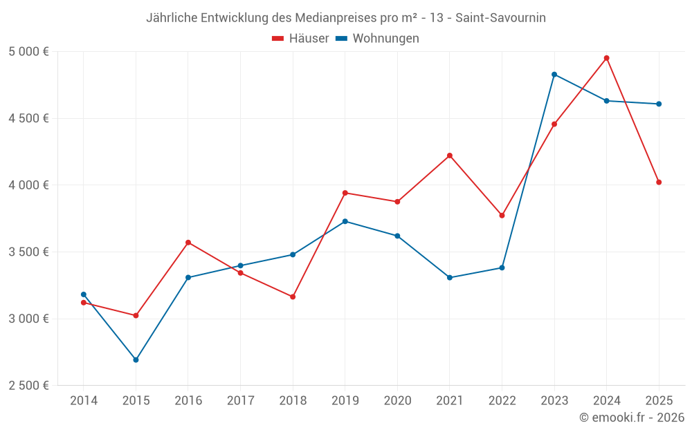 Der Durchschnittspreis auf den 23 Hausgeschäften der letzten 12 Monate in der Gemeinde Saint-Savournin betrug 4 429 € pro Quadratmeter für einen mittleren Immobilienwert von 468 350 €. Über diesen Zeitraum hinweg lagen 60% der Transaktionen zwischen 3 514 und 5 329 € pro Quadratmeter (vom 2. bis zum 8. Dezil).