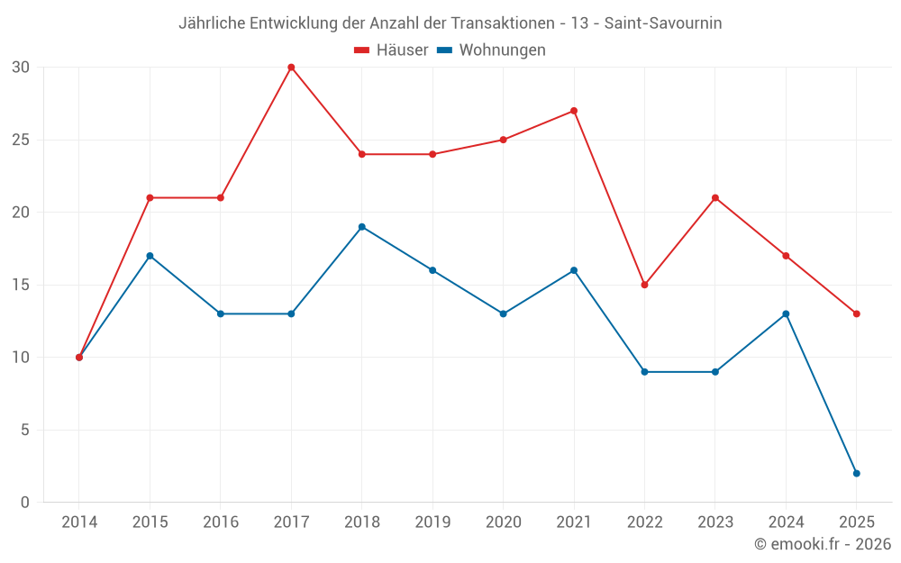Der Durchschnittspreis auf den 19 Wohnungstransaktionen der letzten 24 Monate in der Gemeinde Saint-Savournin betrug 4 694 € pro Quadratmeter für einen mittleren Immobilienwert von 249 050 €. Über diesen Zeitraum hinweg lagen 60% der Transaktionen zwischen 3 171 und 5 025 € pro Quadratmeter (vom 2. bis zum 8. Dezil).