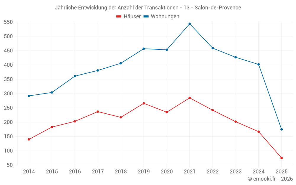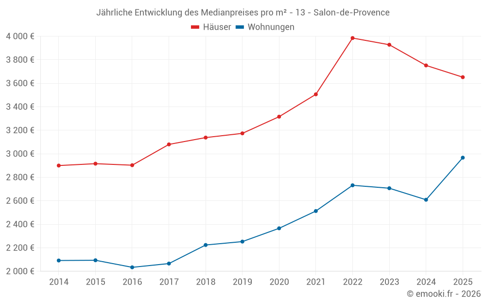 Der Durchschnittspreis auf den 29 Hausgeschäften der letzten 3 Monate in der Gemeinde Salon-de-Provence betrug 3 593 € pro Quadratmeter für einen mittleren Immobilienwert von 355 700 €. Über diesen Zeitraum hinweg lagen 60% der Transaktionen zwischen 2 456 und 4 556 € pro Quadratmeter (vom 2. bis zum 8. Dezil).