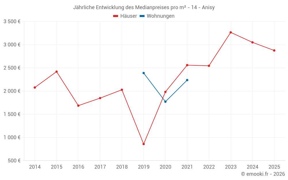 Der Durchschnittspreis auf den 15 Hausgeschäften der letzten 24 Monate in der Gemeinde Anisy betrug 2 875 € pro Quadratmeter für einen mittleren Immobilienwert von 377 030 €. Über diesen Zeitraum hinweg lagen 60% der Transaktionen zwischen 2 431 und 3 354 € pro Quadratmeter (vom 2. bis zum 8. Dezil).