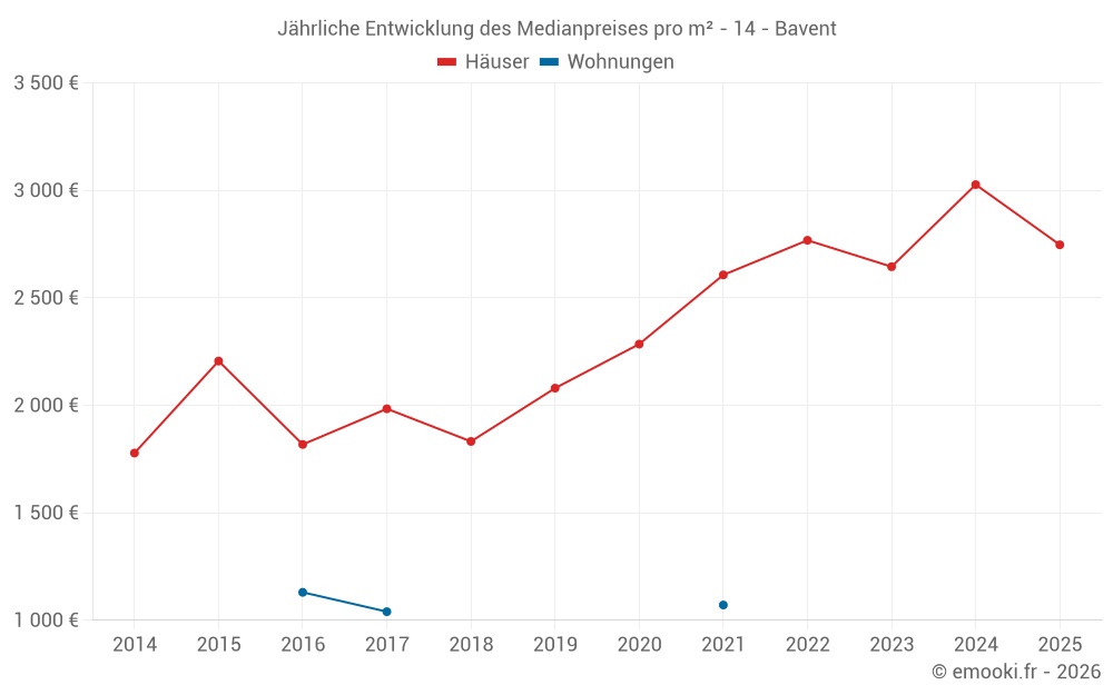 Der Durchschnittspreis auf den 24 Hausgeschäften der letzten 12 Monate in der Gemeinde Bavent betrug 2 774 € pro Quadratmeter für einen mittleren Immobilienwert von 281 010 €. Über diesen Zeitraum hinweg lagen 60% der Transaktionen zwischen 2 134 und 3 326 € pro Quadratmeter (vom 2. bis zum 8. Dezil).