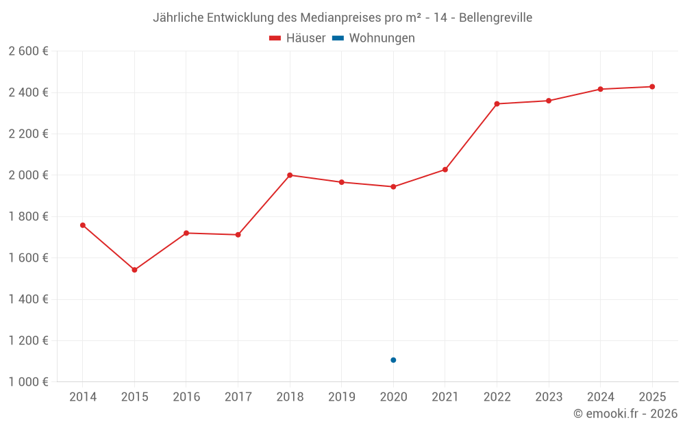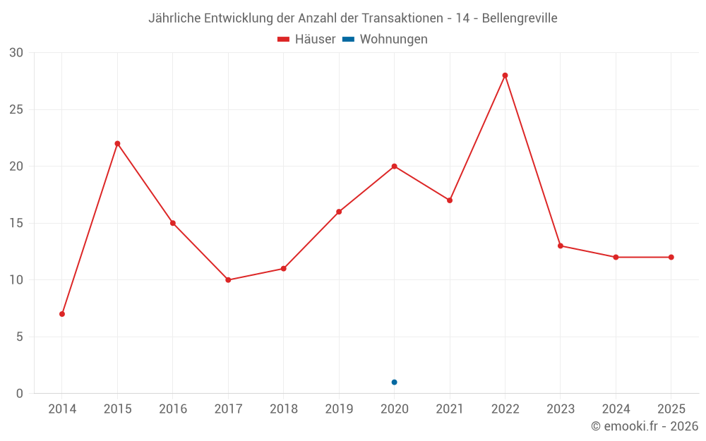 Der Durchschnittspreis auf den 23 Hausgeschäften der letzten 12 Monate in der Gemeinde Bellengreville betrug 2 418 € pro Quadratmeter für einen mittleren Immobilienwert von 210 400 €. Über diesen Zeitraum hinweg lagen 60% der Transaktionen zwischen 1 963 und 2 856 € pro Quadratmeter (vom 2. bis zum 8. Dezil).