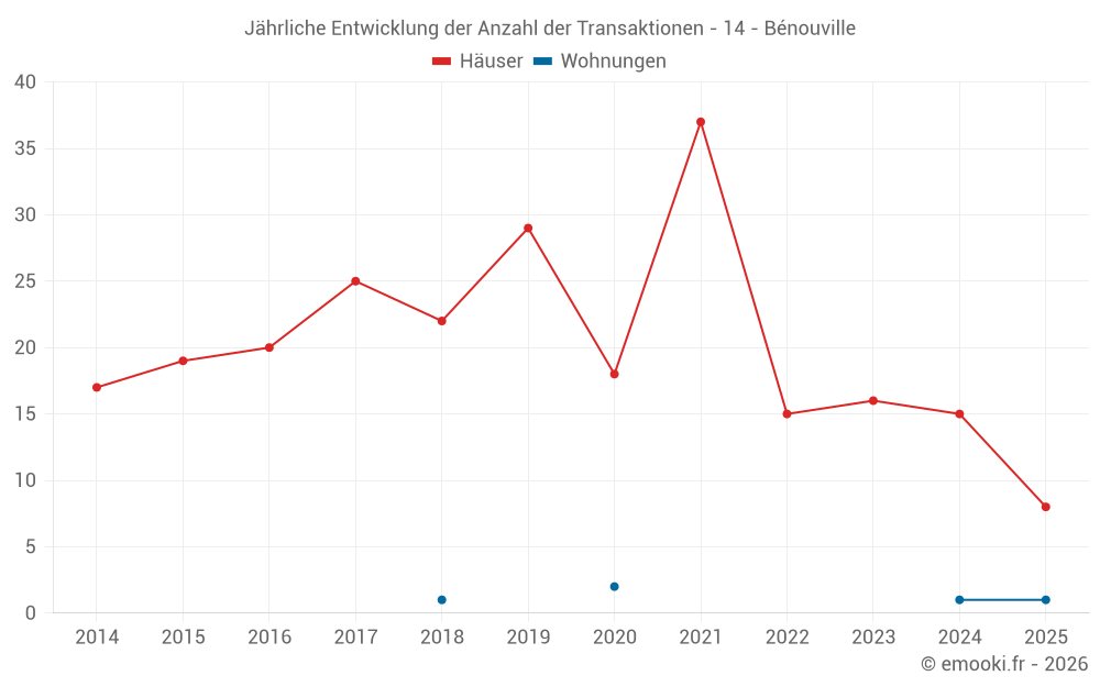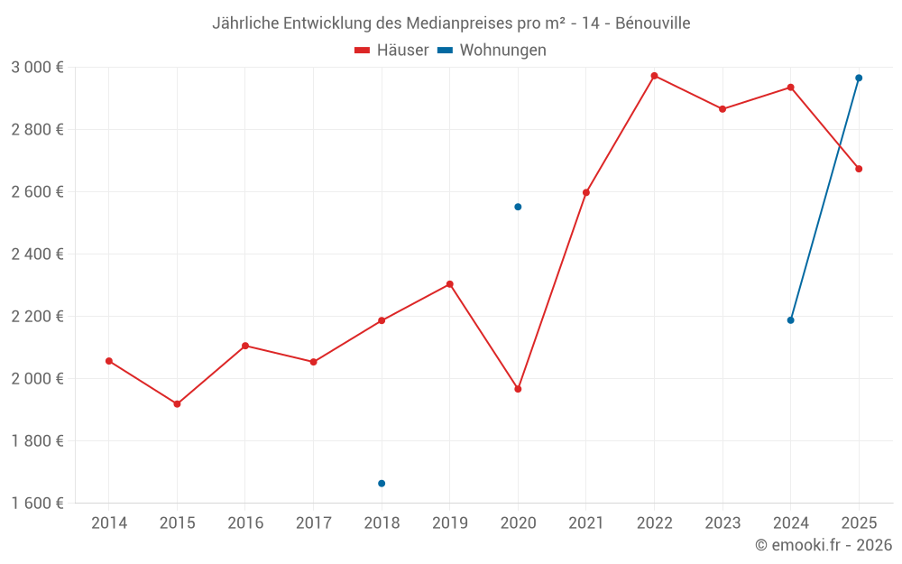 Der Durchschnittspreis auf den 30 Hausgeschäften der letzten 24 Monate in der Gemeinde Bénouville betrug 2 908 € pro Quadratmeter für einen mittleren Immobilienwert von 321 862 €. Über diesen Zeitraum hinweg lagen 60% der Transaktionen zwischen 2 362 und 3 267 € pro Quadratmeter (vom 2. bis zum 8. Dezil).