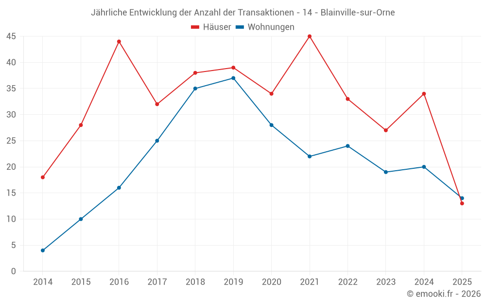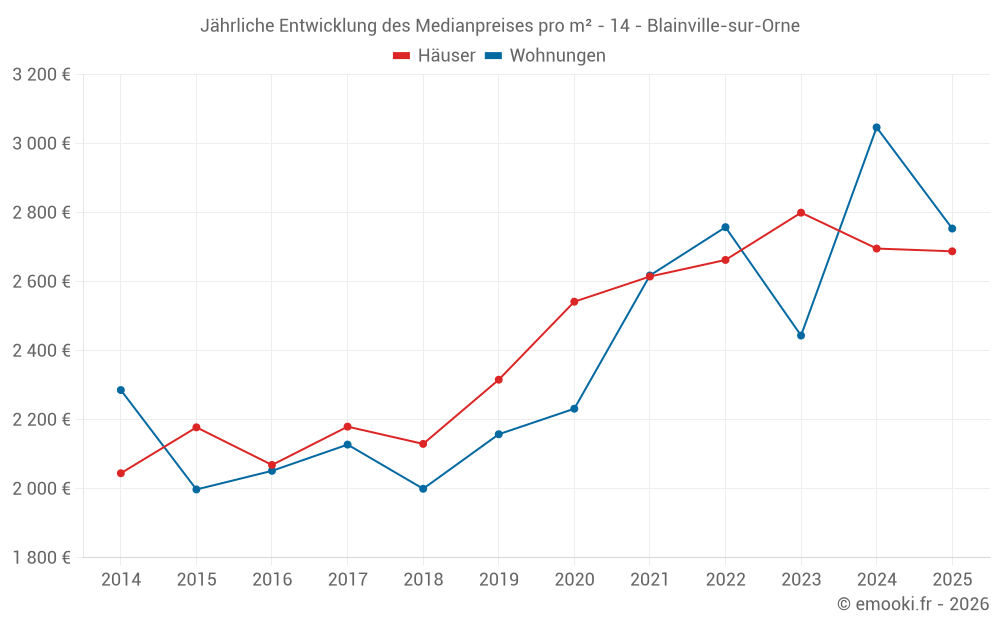 Der Durchschnittspreis auf den 26 Wohnungstransaktionen der letzten 12 Monate in der Gemeinde Blainville-sur-Orne betrug 2 878 € pro Quadratmeter für einen mittleren Immobilienwert von 154 150 €. Über diesen Zeitraum hinweg lagen 60% der Transaktionen zwischen 2 267 und 3 295 € pro Quadratmeter (vom 2. bis zum 8. Dezil).