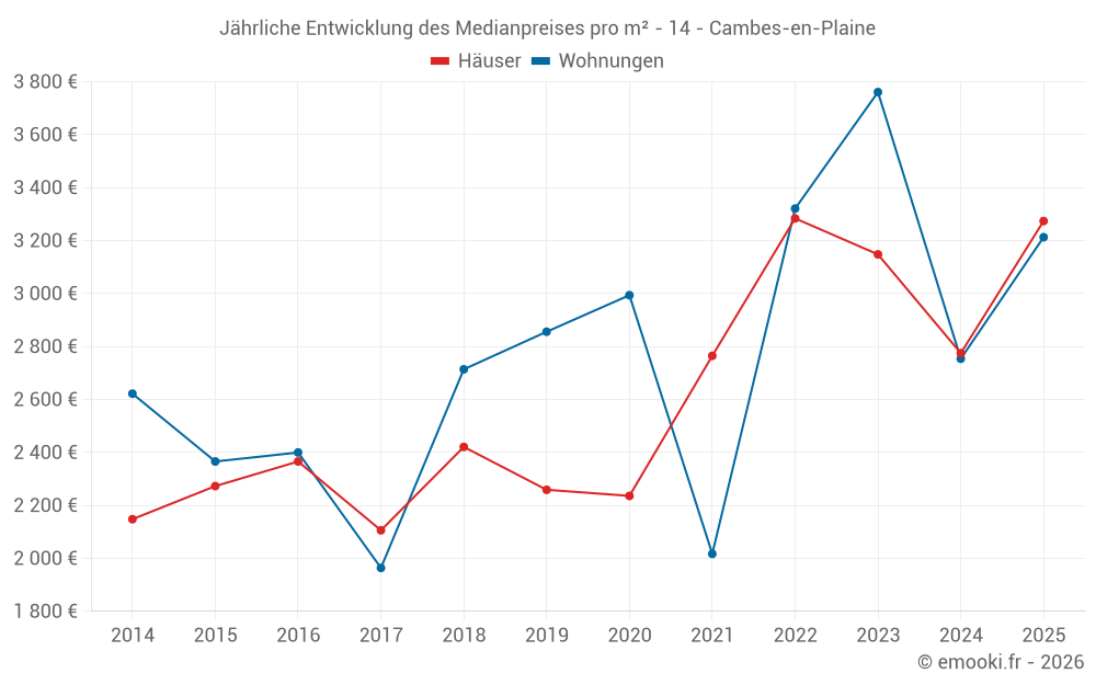 Der Durchschnittspreis auf den 27 Hausgeschäften der letzten 12 Monate in der Gemeinde Cambes-en-Plaine betrug 2 983 € pro Quadratmeter für einen mittleren Immobilienwert von 330 000 €. Über diesen Zeitraum hinweg lagen 60% der Transaktionen zwischen 2 503 und 3 296 € pro Quadratmeter (vom 2. bis zum 8. Dezil).
