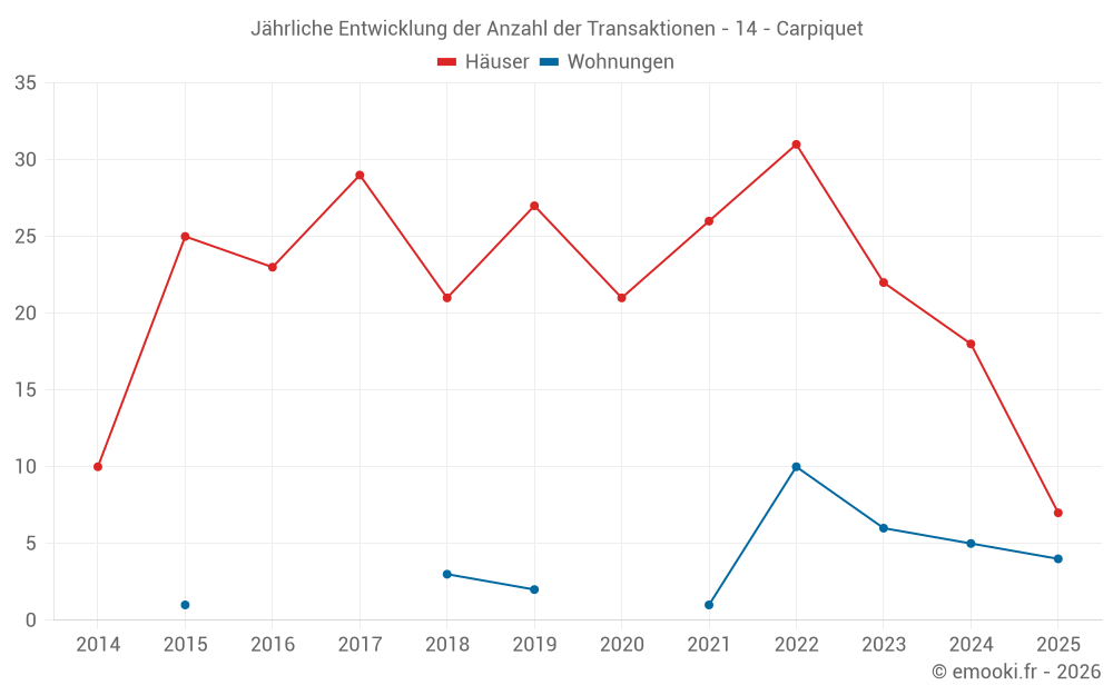 Der Durchschnittspreis auf den 38 Hausgeschäften der letzten 24 Monate in der Gemeinde Carpiquet betrug 2 826 € pro Quadratmeter für einen mittleren Immobilienwert von 245 625 €. Über diesen Zeitraum hinweg lagen 60% der Transaktionen zwischen 2 195 und 3 213 € pro Quadratmeter (vom 2. bis zum 8. Dezil).