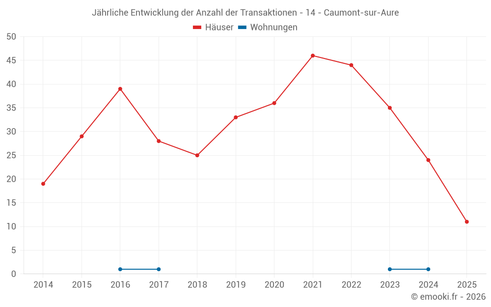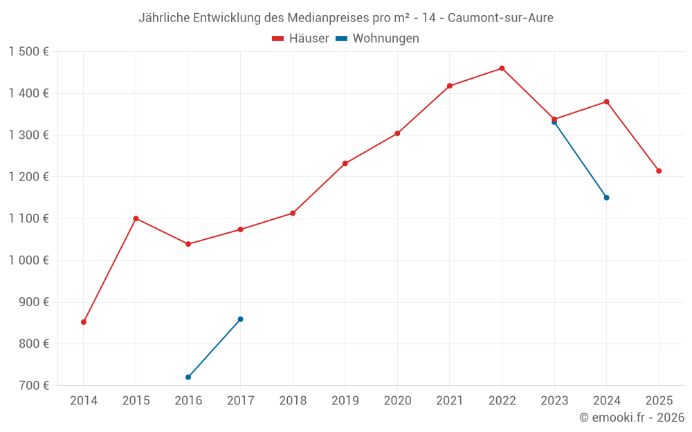 Der Durchschnittspreis auf den 29 Hausgeschäften der letzten 12 Monate in der Gemeinde Caumont-sur-Aure betrug 1 348 € pro Quadratmeter für einen mittleren Immobilienwert von 119 680 €. Über diesen Zeitraum hinweg lagen 60% der Transaktionen zwischen 807 und 1 642 € pro Quadratmeter (vom 2. bis zum 8. Dezil).