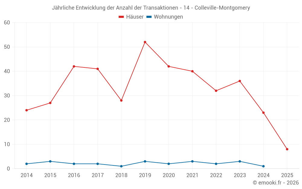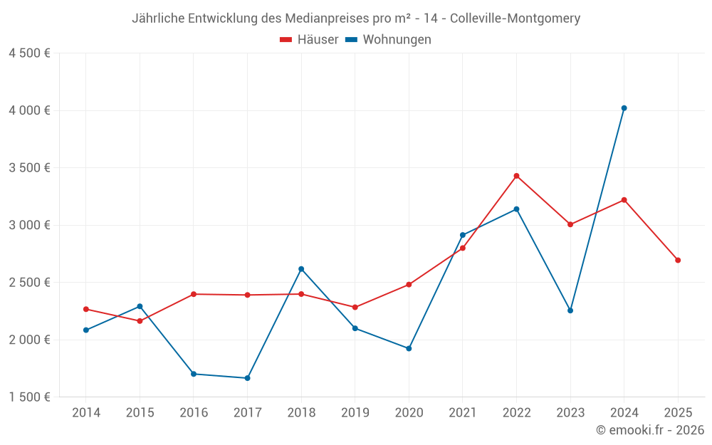 Der Durchschnittspreis auf den 23 Hausgeschäften der letzten 12 Monate in der Gemeinde Colleville-Montgomery betrug 2 956 € pro Quadratmeter für einen mittleren Immobilienwert von 313 000 €. Über diesen Zeitraum hinweg lagen 60% der Transaktionen zwischen 2 607 und 3 503 € pro Quadratmeter (vom 2. bis zum 8. Dezil).
