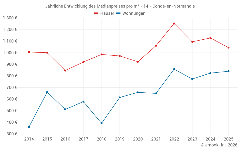 Der Durchschnittspreis auf den 20 Wohnungstransaktionen der letzten 12 Monate in der Gemeinde Condé-en-Normandie betrug 854 € pro Quadratmeter für einen mittleren Immobilienwert von 55 540 €. Über diesen Zeitraum hinweg lagen 60% der Transaktionen zwischen 718 und 1 168 € pro Quadratmeter (vom 2. bis zum 8. Dezil).