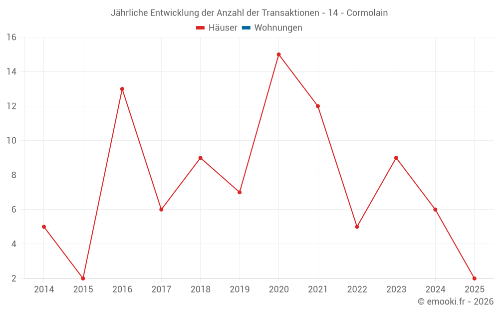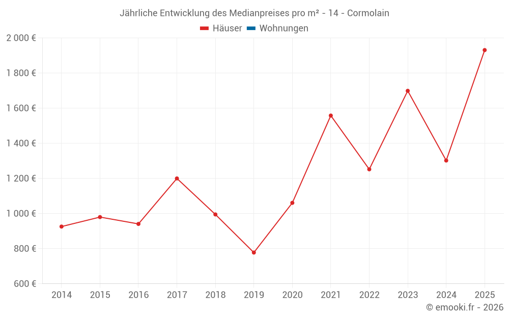 Der Durchschnittspreis auf den 14 Hausgeschäften der letzten 24 Monate in der Gemeinde Cormolain betrug 1 460 € pro Quadratmeter für einen mittleren Immobilienwert von 127 140 €. Über diesen Zeitraum hinweg lagen 60% der Transaktionen zwischen 1 256 und 1 747 € pro Quadratmeter (vom 2. bis zum 8. Dezil).