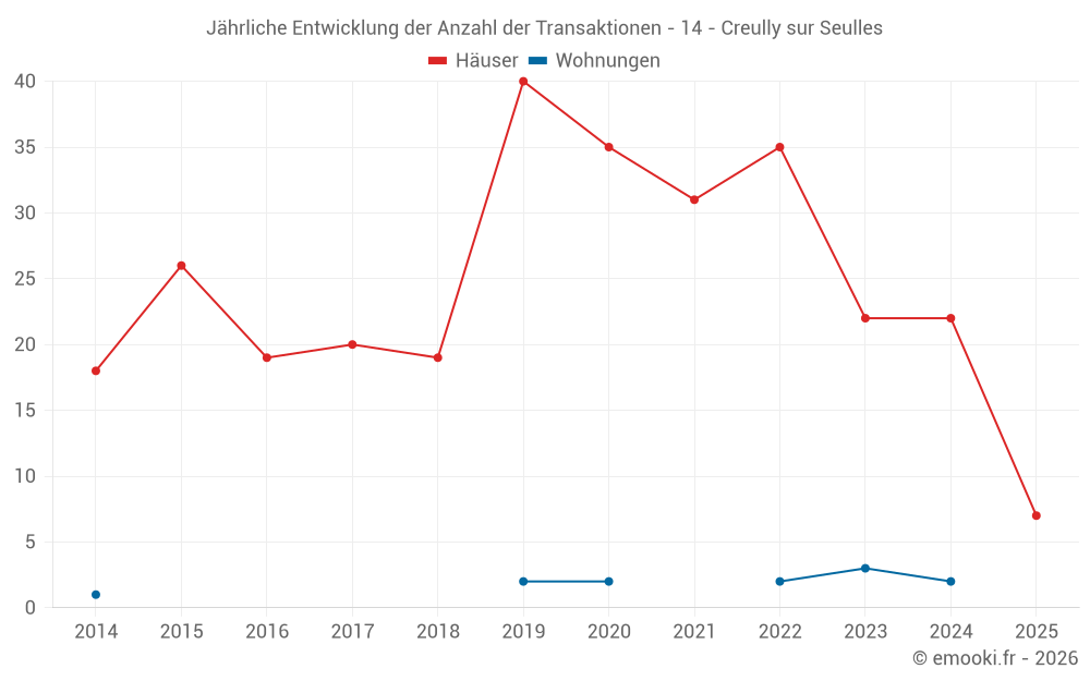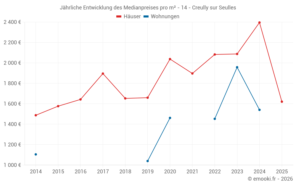 Der Durchschnittspreis auf den 21 Hausgeschäften der letzten 12 Monate in der Gemeinde Creully sur Seulles betrug 2 113 € pro Quadratmeter für einen mittleren Immobilienwert von 233 000 €. Über diesen Zeitraum hinweg lagen 60% der Transaktionen zwischen 1 542 und 2 592 € pro Quadratmeter (vom 2. bis zum 8. Dezil).