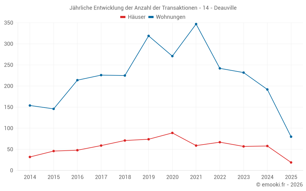Der Durchschnittspreis auf den 19 Hausgeschäften der letzten 6 Monate in der Gemeinde Deauville betrug 6 297 € pro Quadratmeter für einen mittleren Immobilienwert von 575 000 €. Über diesen Zeitraum hinweg lagen 60% der Transaktionen zwischen 3 429 und 8 096 € pro Quadratmeter (vom 2. bis zum 8. Dezil).