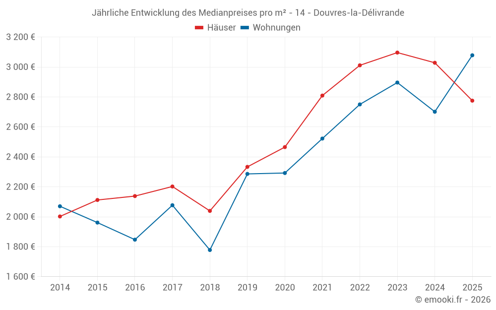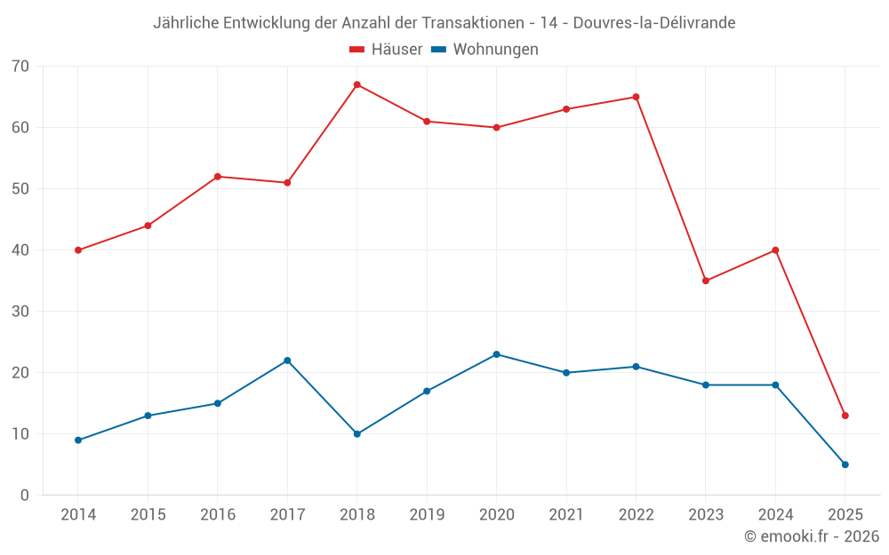 Der Durchschnittspreis auf den 38 Hausgeschäften der letzten 12 Monate in der Gemeinde Douvres-la-Délivrande betrug 2 936 € pro Quadratmeter für einen mittleren Immobilienwert von 280 000 €. Über diesen Zeitraum hinweg lagen 60% der Transaktionen zwischen 2 514 und 3 337 € pro Quadratmeter (vom 2. bis zum 8. Dezil).