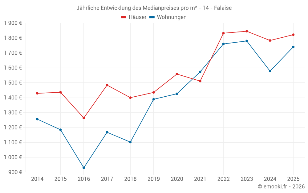 Der Durchschnittspreis auf den 39 Hausgeschäften der letzten 12 Monate in der Gemeinde Falaise betrug 1 824 € pro Quadratmeter für einen mittleren Immobilienwert von 172 000 €. Über diesen Zeitraum hinweg lagen 60% der Transaktionen zwischen 1 340 und 2 320 € pro Quadratmeter (vom 2. bis zum 8. Dezil).