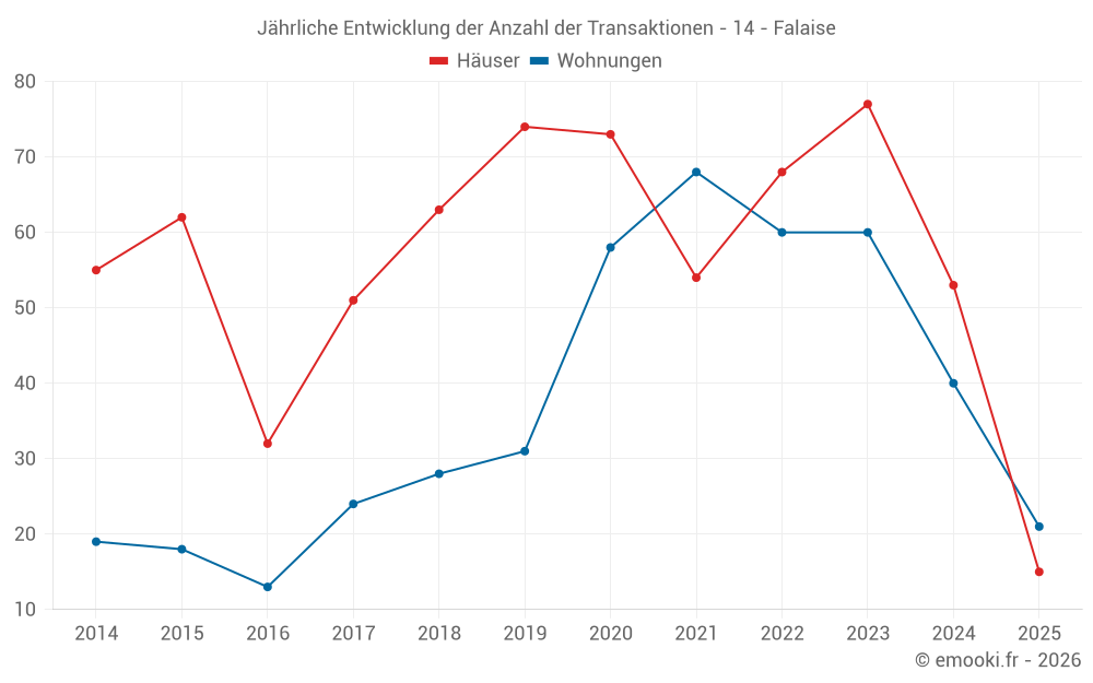 Der Durchschnittspreis auf den 21 Wohnungstransaktionen der letzten 6 Monate in der Gemeinde Falaise betrug 1 740 € pro Quadratmeter für einen mittleren Immobilienwert von 127 000 €. Über diesen Zeitraum hinweg lagen 60% der Transaktionen zwischen 1 225 und 2 649 € pro Quadratmeter (vom 2. bis zum 8. Dezil).