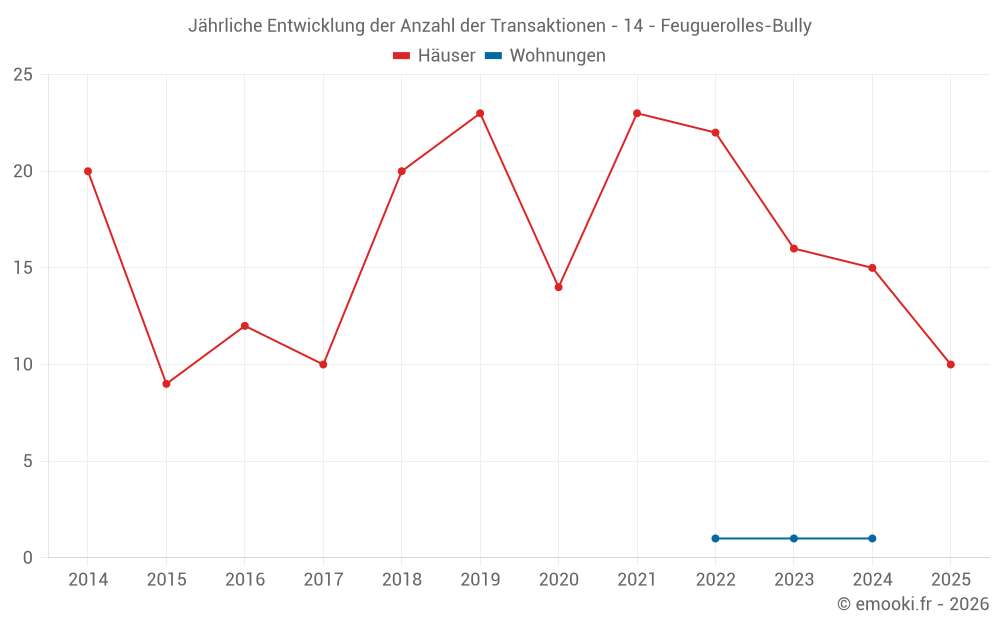 Der Durchschnittspreis auf den 21 Hausgeschäften der letzten 12 Monate in der Gemeinde Feuguerolles-Bully betrug 2 759 € pro Quadratmeter für einen mittleren Immobilienwert von 271 500 €. Über diesen Zeitraum hinweg lagen 60% der Transaktionen zwischen 2 055 und 2 888 € pro Quadratmeter (vom 2. bis zum 8. Dezil).