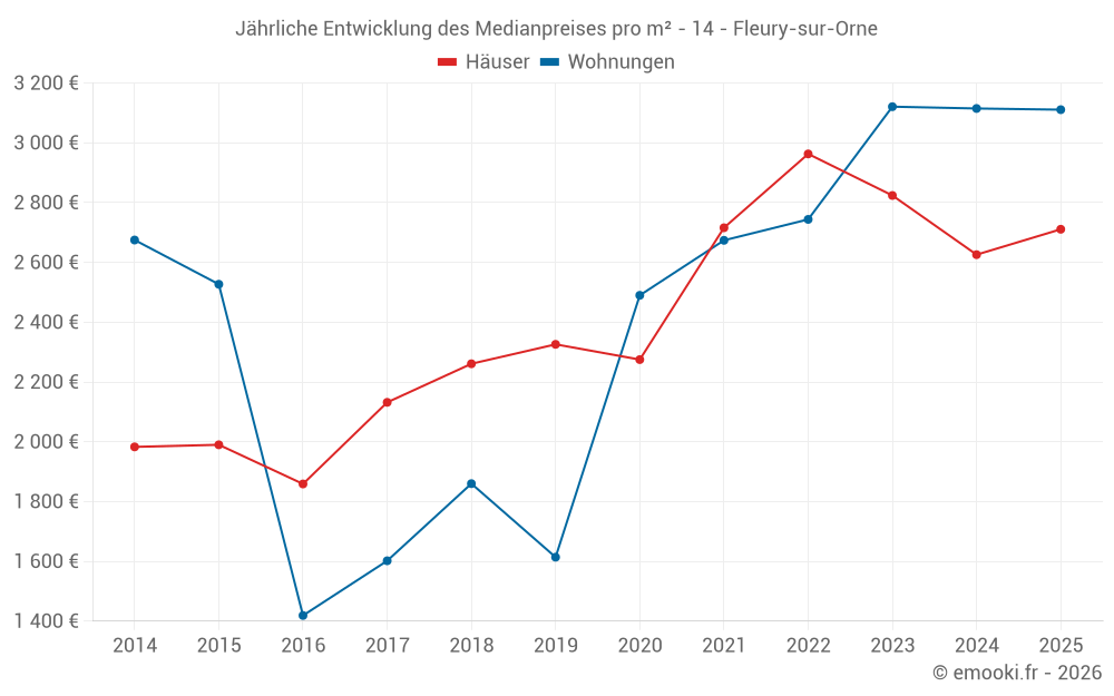 Der Durchschnittspreis auf den 27 Wohnungstransaktionen der letzten 12 Monate in der Gemeinde Fleury-sur-Orne betrug 3 000 € pro Quadratmeter für einen mittleren Immobilienwert von 145 000 €. Über diesen Zeitraum hinweg lagen 60% der Transaktionen zwischen 2 672 und 3 633 € pro Quadratmeter (vom 2. bis zum 8. Dezil).
