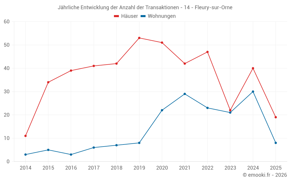 Der Durchschnittspreis auf den 19 Hausgeschäften der letzten 6 Monate in der Gemeinde Fleury-sur-Orne betrug 2 711 € pro Quadratmeter für einen mittleren Immobilienwert von 223 830 €. Über diesen Zeitraum hinweg lagen 60% der Transaktionen zwischen 2 205 und 2 932 € pro Quadratmeter (vom 2. bis zum 8. Dezil).