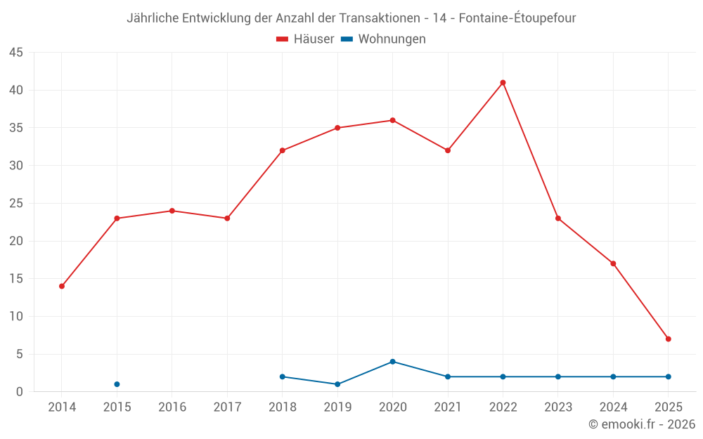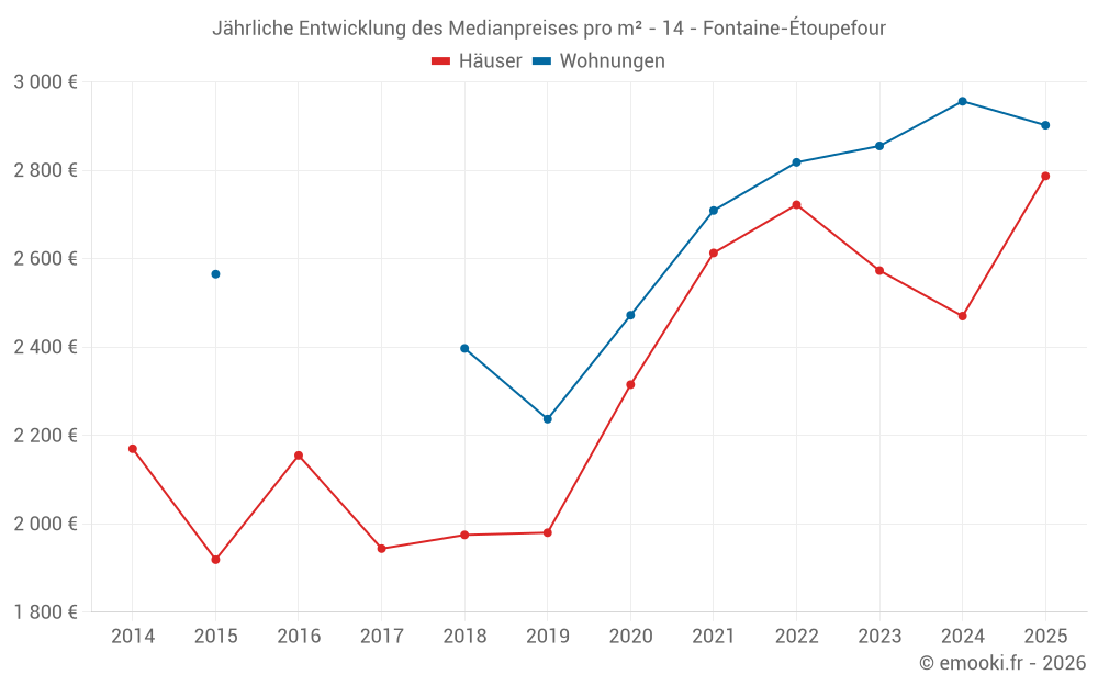 Der Durchschnittspreis auf den 35 Hausgeschäften der letzten 24 Monate in der Gemeinde Fontaine-Étoupefour betrug 2 541 € pro Quadratmeter für einen mittleren Immobilienwert von 270 000 €. Über diesen Zeitraum hinweg lagen 60% der Transaktionen zwischen 1 923 und 2 851 € pro Quadratmeter (vom 2. bis zum 8. Dezil).