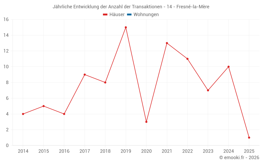 Der Durchschnittspreis auf den 15 Hausgeschäften der letzten 24 Monate in der Gemeinde Fresné-la-Mère betrug 1 536 € pro Quadratmeter für einen mittleren Immobilienwert von 165 000 €. Über diesen Zeitraum hinweg lagen 60% der Transaktionen zwischen 1 196 und 2 018 € pro Quadratmeter (vom 2. bis zum 8. Dezil).