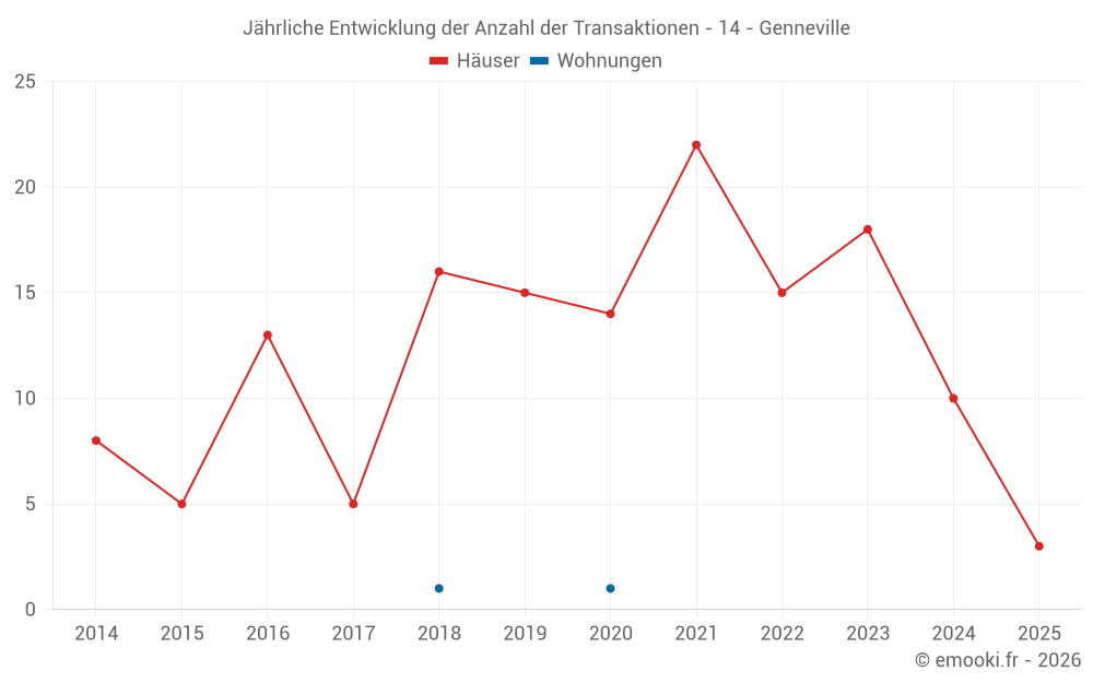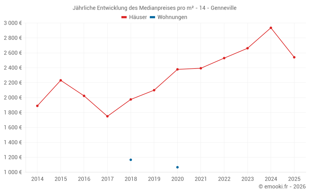 Der Durchschnittspreis auf den 23 Hausgeschäften der letzten 24 Monate in der Gemeinde Genneville betrug 2 717 € pro Quadratmeter für einen mittleren Immobilienwert von 277 637 €. Über diesen Zeitraum hinweg lagen 60% der Transaktionen zwischen 2 110 und 3 232 € pro Quadratmeter (vom 2. bis zum 8. Dezil).