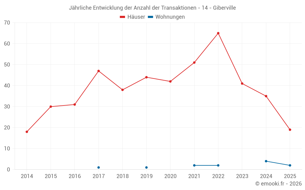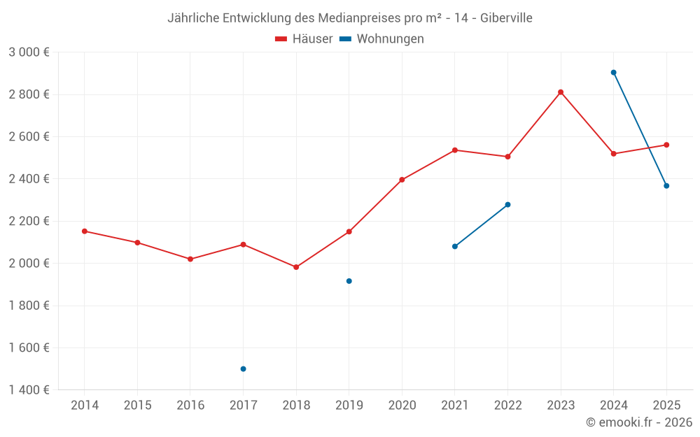 Der Durchschnittspreis auf den 19 Hausgeschäften der letzten 6 Monate in der Gemeinde Giberville betrug 2 561 € pro Quadratmeter für einen mittleren Immobilienwert von 235 000 €. Über diesen Zeitraum hinweg lagen 60% der Transaktionen zwischen 2 116 und 2 957 € pro Quadratmeter (vom 2. bis zum 8. Dezil).