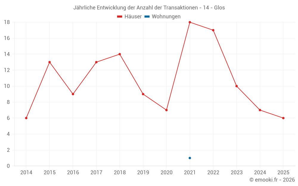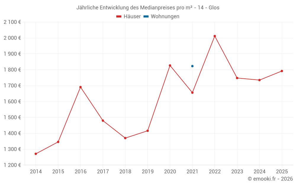 Der Durchschnittspreis auf den 19 Hausgeschäften der letzten 24 Monate in der Gemeinde Glos betrug 1 755 € pro Quadratmeter für einen mittleren Immobilienwert von 199 900 €. Über diesen Zeitraum hinweg lagen 60% der Transaktionen zwischen 1 335 und 2 016 € pro Quadratmeter (vom 2. bis zum 8. Dezil).