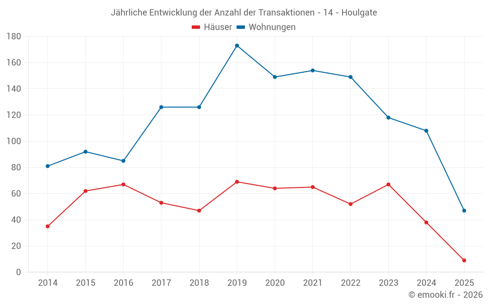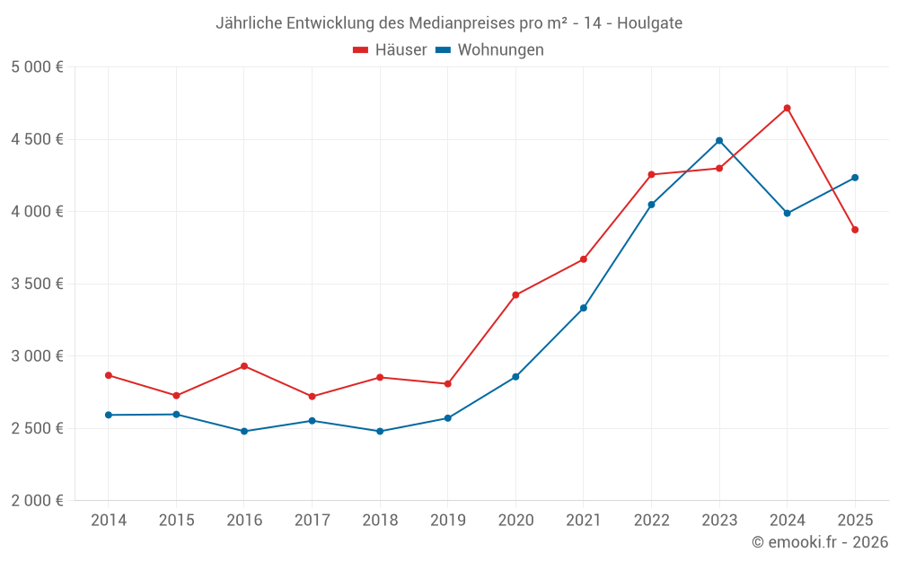 Der Durchschnittspreis auf den 27 Hausgeschäften der letzten 12 Monate in der Gemeinde Houlgate betrug 4 643 € pro Quadratmeter für einen mittleren Immobilienwert von 400 000 €. Über diesen Zeitraum hinweg lagen 60% der Transaktionen zwischen 3 301 und 5 467 € pro Quadratmeter (vom 2. bis zum 8. Dezil).