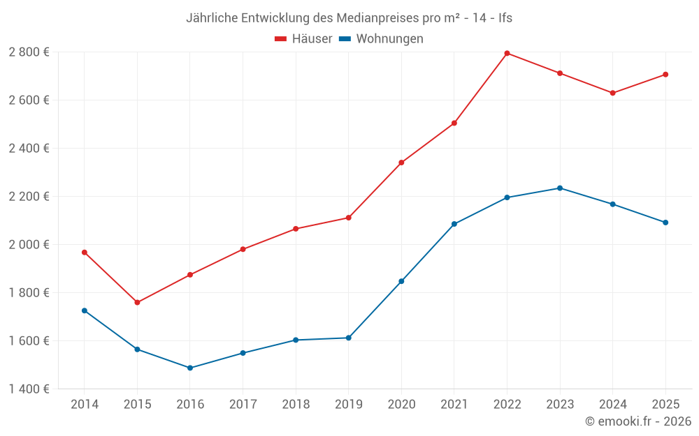 Der Durchschnittspreis auf den 57 Hausgeschäften der letzten 12 Monate in der Gemeinde Ifs betrug 2 609 € pro Quadratmeter für einen mittleren Immobilienwert von 240 000 €. Über diesen Zeitraum hinweg lagen 60% der Transaktionen zwischen 2 277 und 3 102 € pro Quadratmeter (vom 2. bis zum 8. Dezil).
