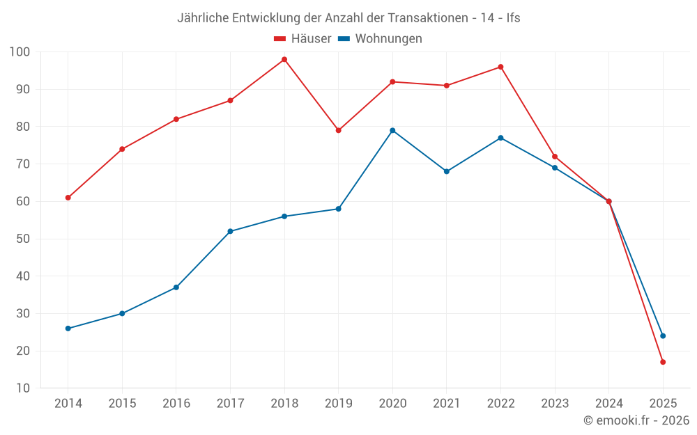 Der Durchschnittspreis auf den 24 Wohnungstransaktionen der letzten 6 Monate in der Gemeinde Ifs betrug 2 092 € pro Quadratmeter für einen mittleren Immobilienwert von 121 500 €. Über diesen Zeitraum hinweg lagen 60% der Transaktionen zwischen 1 787 und 2 784 € pro Quadratmeter (vom 2. bis zum 8. Dezil).
