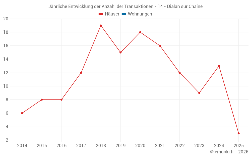 Der Durchschnittspreis auf den 19 Hausgeschäften der letzten 24 Monate in der Gemeinde Dialan sur Chaîne betrug 1 574 € pro Quadratmeter für einen mittleren Immobilienwert von 154 225 €. Über diesen Zeitraum hinweg lagen 60% der Transaktionen zwischen 1 164 und 1 913 € pro Quadratmeter (vom 2. bis zum 8. Dezil).