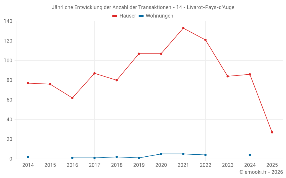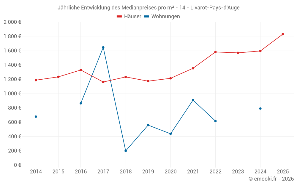 Der Durchschnittspreis auf den 27 Hausgeschäften der letzten 6 Monate in der Gemeinde Livarot-Pays-d'Auge betrug 1 831 € pro Quadratmeter für einen mittleren Immobilienwert von 200 000 €. Über diesen Zeitraum hinweg lagen 60% der Transaktionen zwischen 1 033 und 2 245 € pro Quadratmeter (vom 2. bis zum 8. Dezil).
