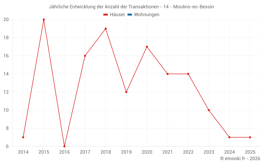 Der Durchschnittspreis auf den 18 Hausgeschäften der letzten 24 Monate in der Gemeinde Moulins-en-Bessin betrug 2 214 € pro Quadratmeter für einen mittleren Immobilienwert von 237 925 €. Über diesen Zeitraum hinweg lagen 60% der Transaktionen zwischen 1 386 und 3 030 € pro Quadratmeter (vom 2. bis zum 8. Dezil).
