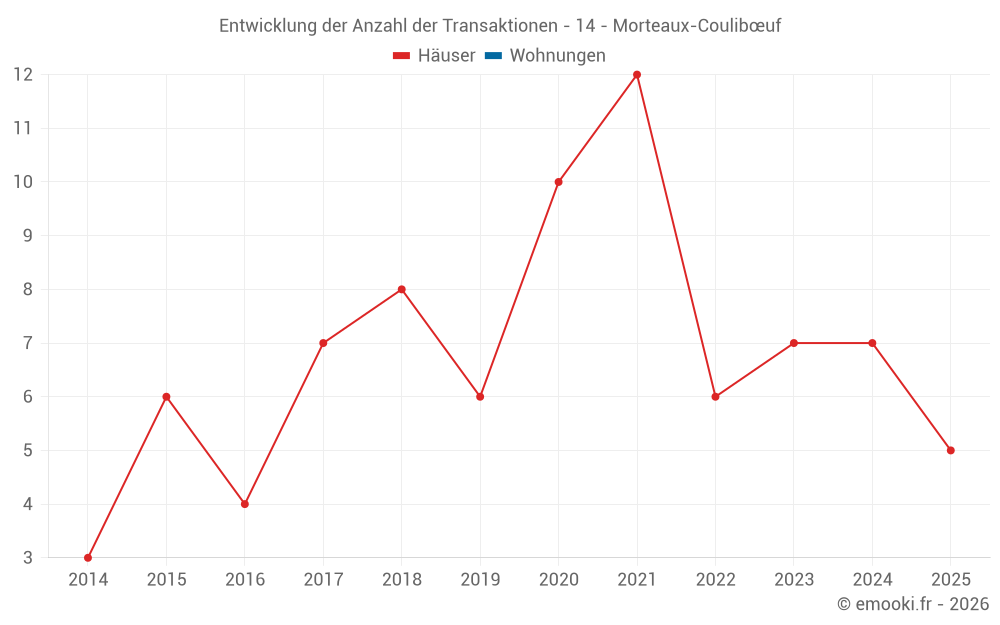 Der Durchschnittspreis auf den 15 Hausgeschäften der letzten 24 Monate in der Gemeinde Morteaux-Coulibœuf betrug 1 765 € pro Quadratmeter für einen mittleren Immobilienwert von 159 000 €. Über diesen Zeitraum hinweg lagen 60% der Transaktionen zwischen 1 335 und 1 977 € pro Quadratmeter (vom 2. bis zum 8. Dezil).