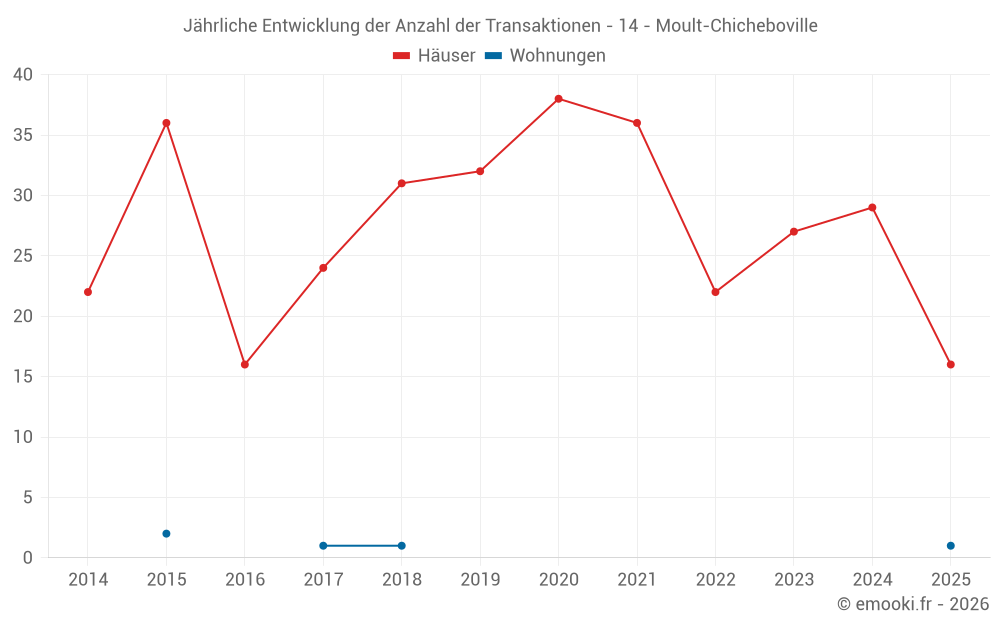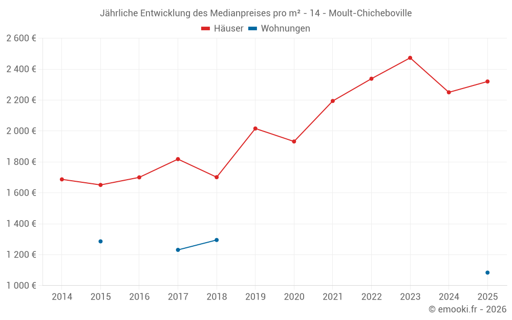 Der Durchschnittspreis auf den 30 Hausgeschäften der letzten 12 Monate in der Gemeinde Moult-Chicheboville betrug 2 269 € pro Quadratmeter für einen mittleren Immobilienwert von 236 500 €. Über diesen Zeitraum hinweg lagen 60% der Transaktionen zwischen 1 809 und 2 725 € pro Quadratmeter (vom 2. bis zum 8. Dezil).